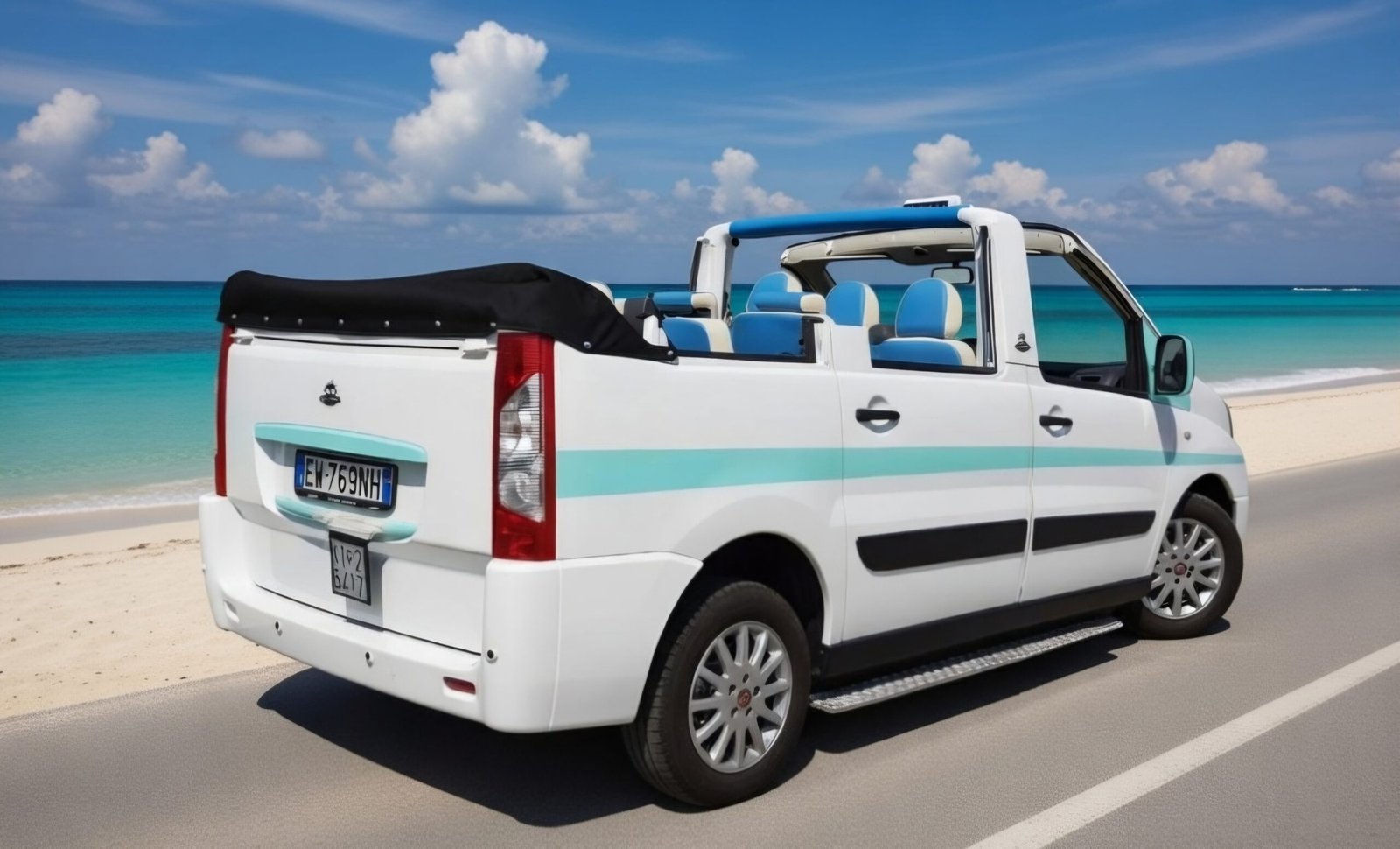 Progettata e realizzata artigianalmente da Giovanni Vernagallo e dal team Vernagallo Stile©, questa trasformazione trasforma il van Fiat Scudo in una cabriolet spaziosa a 9 posti, con tetto apribile, struttura rinforzata e design mediterraneo che unisce funzionalità, sicurezza e fascino turistico.